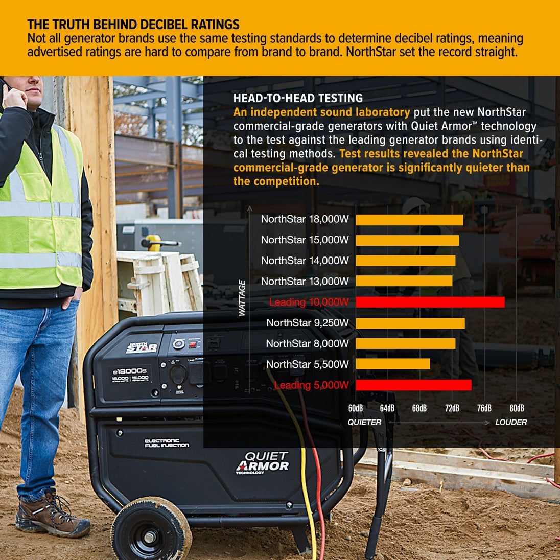 • Quiet Armor™ Technology delivers up to 20% less noise as measured (in dBA) against leading, commercial-grade portable generators*